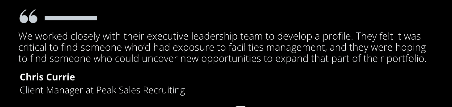 RESULTS: In the end, Peak’s team had a list of 68 potential candidates, and spoke to 31 of them who were pre-screened and about half were interesting enough to be vetted. Ten of those candidates were passed on to Sodexo. Despite the steep requirements, Peak got their player/coach with strong sales skills, experience in facilities management and food services, and the energy to find and develop new clients. Together with three business development managers — all direct reports — the VP is responsible for new client acquisitions and partnership agreements with businesses.